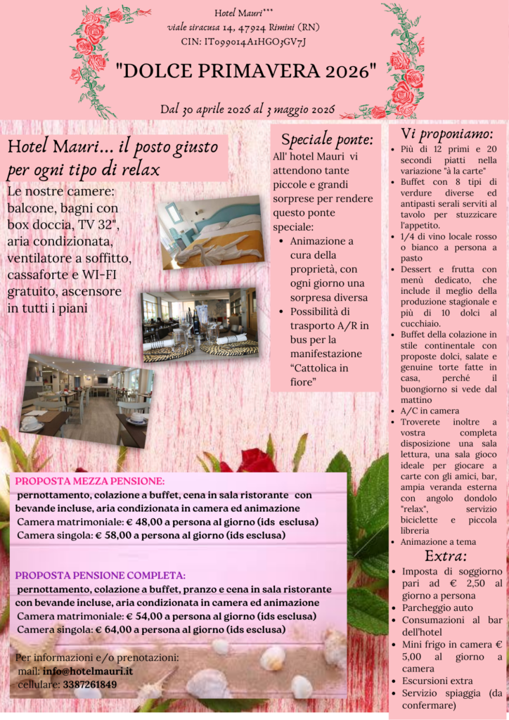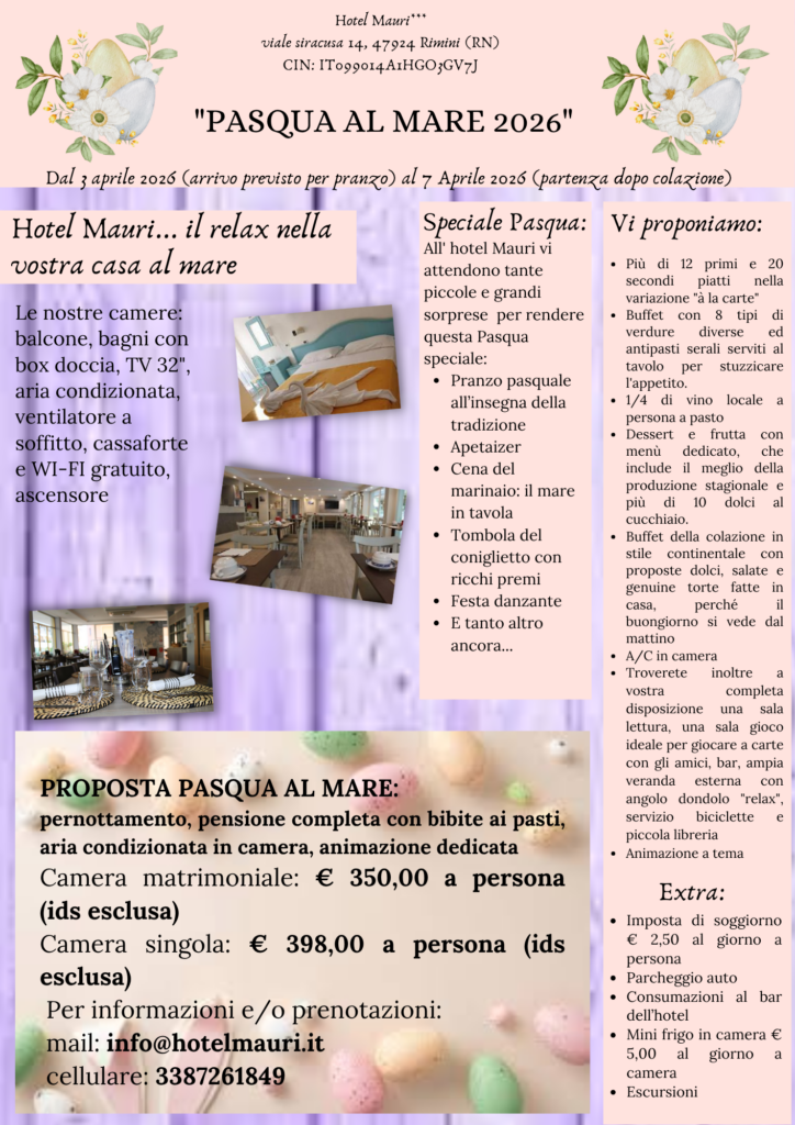 Festeggia con noi al mare la vostra Pasqua speciale! La voglia di prendersi una pausa è sempre più forte? La voglia di mare è alta ma le vacanze troppo lontane? La curiosità di nuovi posti e nuove emozioni fa capolino? Allora non resta che seguire il detto “Natale con i tuoi, Pasqua con chi vuoi". Ad accogliervi ci saremo noi, con un mix di buona cucina appetitosa e primaverile, divertimento, ospitalità, sorrisi e la bellezza senza tempo e stagioni di Rimini e della Romagna. Di seguito ecco la nostra proposta in dettaglio: